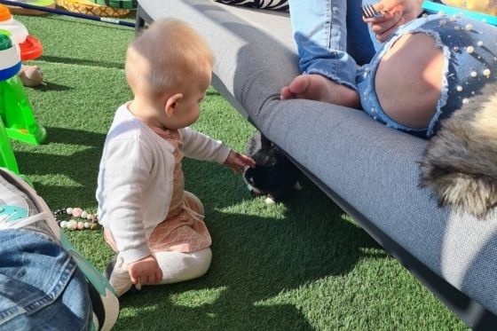 Toen we haar de volgende morgen vertelden dat Teun een sterretje was geworden keek ze richting zijn (lege) huisje en stak haar handjes in de lucht. Haar manier om aan te duiden dat ze iets niet weet en ze begon hem te zoeken op de plekjes waar hij vaak lag. Op haar speelkleed, onder het bankje op ons balkon en nog eens in zijn huisje. Ze zocht haar konijnenbroer Teun. Dat deed ze de hele morgen tussen het spelen door tot we vertrokken richting de dierenarts om afscheid te nemen. Eenmaal daar vouwde de dierenarts de handdoek waar Teun inlag open en Zannah werd gelijk enthousiast toen ze hem zag. Daar was hij dus. Ze begon hem gelijk te aaien en kusjes geven, maar toen Teun daar niet op reageerde stopte ze even en keek hem een tijdje aan. Daarna ging ze verder met kusjes geven. Met z’n drieën namen we op een mooie manier afscheid van Teun. Zo zeiden we voor de laatste keer gedag tegen onze konijnenzoon en konijnenbroer.