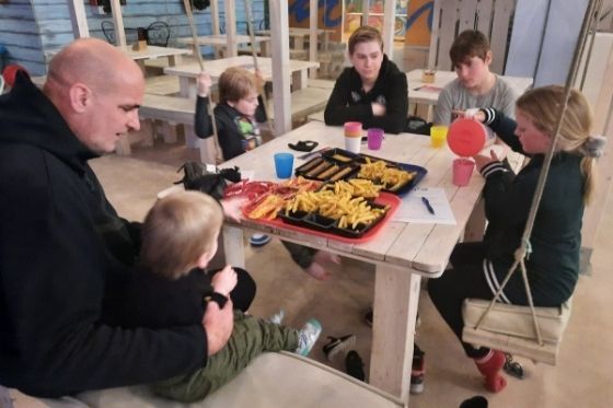 We hebben nog even boven in de skybar een kijkje genomen. Dit zie er ook heel gezellig uit. In deze bar heb je uitzicht over het hele jumppark en klimpark, waardoor je tijdens het wachten naar de kinderen zou kunnen kijken. In de bar zijn normaliter diverse lekkere dingen verkrijgbaar. Wij mochten vandaag lunchen in de beachbar bij de Kids-In. We kregen een heel leuk tafeltje met bankjes en twee schommels als stoeltjes toegewezen. Superleuk voor de kinderen! We kregen patat, een snack en drinken. We werden goed verzorgd, heerlijk zo’n dag.