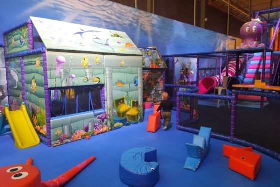Bij binnenkomst werden we direct goed verzorgd en kregen we wat te drinken. Daarna gaf de medewerkster ons een rondleiding door de grote hallen. Het werd ons al snel duidelijk dat we echt de enigen waren hier vandaag. Uiteraard was er wel personeel aanwezig, maar verder niemand. Dit vonden we wel heel bijzonder: een heel speelparadijs voor onszelf!! Het viel me bij binnenkomst meteen op dat de uitstraling en de inrichting hier heel anders is dan bij andere speelparadijzen. Geen plastic kuipstoeltjes, maar mooie en sfeervol ingerichte zithoekjes. Alles doorgetrokken in het strand en onderwater thema.