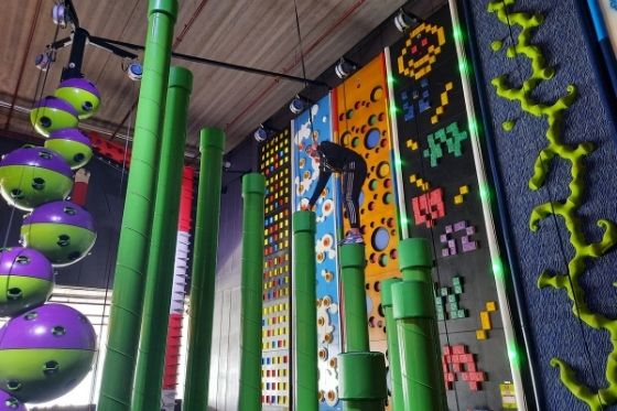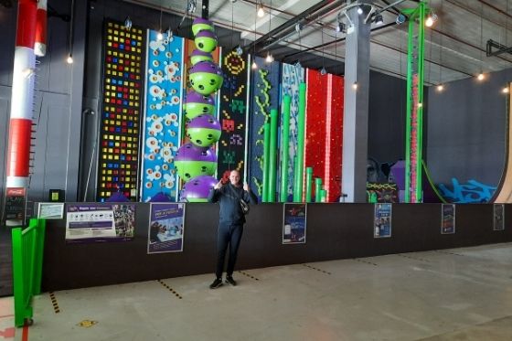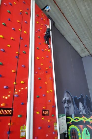 In dit gedeelte staat klimmen centraal. Er zijn onder andere diverse klimmuren. Een klimsessie duurt een uur. Klimervaring is niet nodig, dankzij een innovatief en automatisch zekeringssysteem. De klimmers krijgen hier uitleg over vantevoren en er blijft altijd professionele begeleiding aanwezig in het klimgedeelte. Een begeleider hielp ons. Okee, ik moet zeggen: de begeleider hielp Johan, Jamie, Owen en Faylin, want ik heb hoogtevrees. Daley heeft ook hoogtevrees en Marley was uiteraard nog te klein. Johan en de vier oudsten zijn echte durfals. Ze hebben alle klimattracties gedaan. Wat een ervaring voor ze! Het leukste en spannendste vonden ze “de Vertical Drop Slide”. Hier krijg je een pak aan en word je door een medewerker omhoog gehesen en als je loslaat dan glijd je naar beneden. Hoe hoger je komt, des te steiler het wordt.